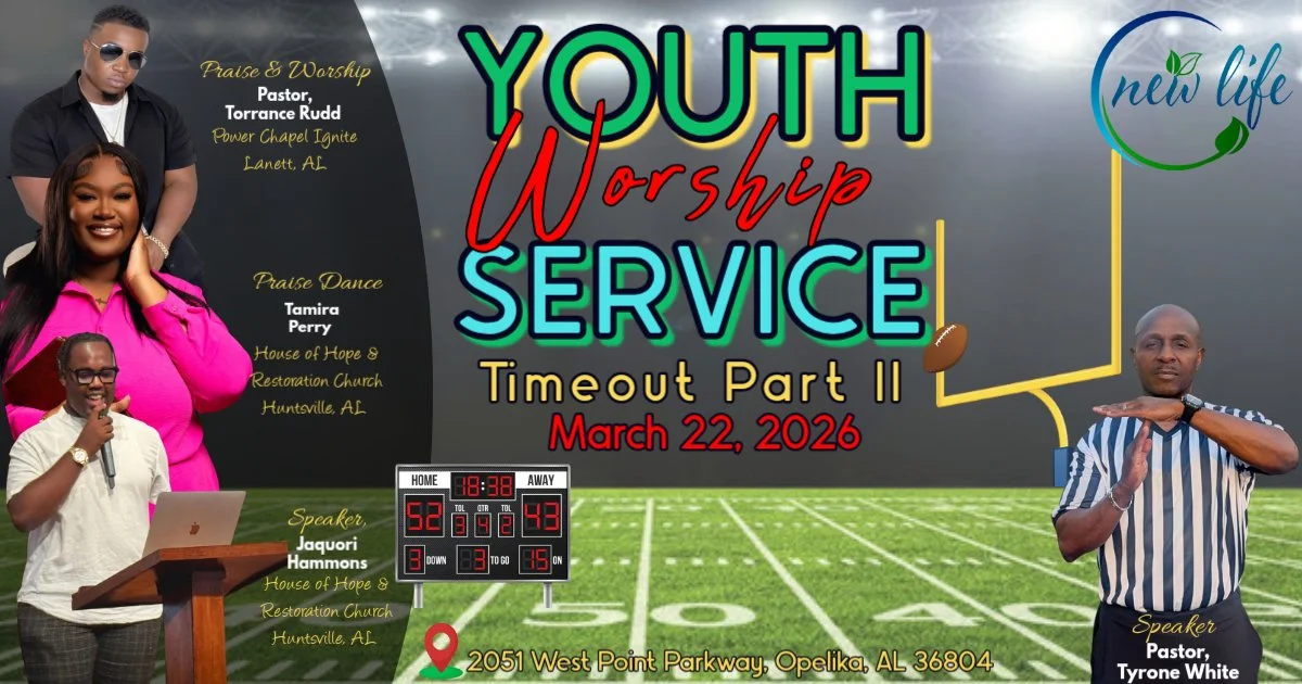 New Life invites you to join us for a powerful Youth Worship Service as we take a spiritual Timeout and refocus on what truly matters—our relationship with God. This will be an exciting time of worship, praise, and a life-changing word designed especially for our youth and young adults. 🙌